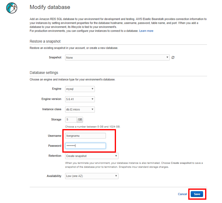 DB는 가장 기본적인 mysql에 모두다 디폴트로 가장 저렴한 버전으로 구성했습니다. 입력할 부분은 Username과 password 부분입니다. 작성 후 Save를 하고 Create environment 버튼을 눌러 환경을 생성합니다.