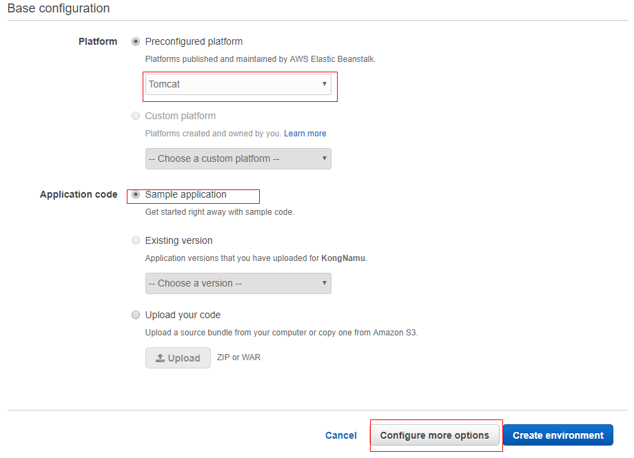 다음은 환경 구성 설정 화면인데 윗부분 Environment information 은 그대로 두고 Base configuration 에서 탐캣을 선택합니다. 또한 소스파일은 나중에 넣을 예정이기에 Sample application을 선택하고(기본) Configure more options를 클릭합니다. Create environment를 클릭하게 되면 가장 기본적인 서버 구성으로 생성되게 됩니다.