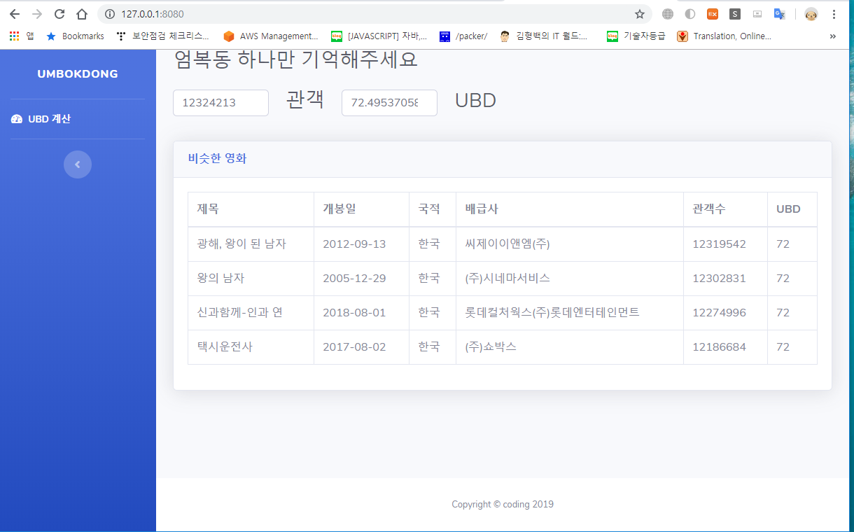 위 박스에 숫자를 입력하면 알아서 UBD를 계산해주고 그와 비슷한 영화목록을 DB에서 가져오는 방식입니다.