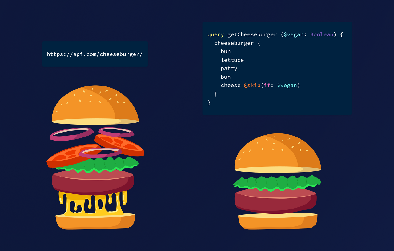 가장 잘 알려진 차이점 중 하나인 질의에 대한 예상 응답의 차이를 매우 간단한 용어로 생각할 때, 우리는 햄버거를 주문하는 과정을 생각할 수 있습니다. GraphQL 버거 밈은 한동안 존재했지만, 여전히 개념을 쉽게 파악할 수 있도록 해 줍니다.