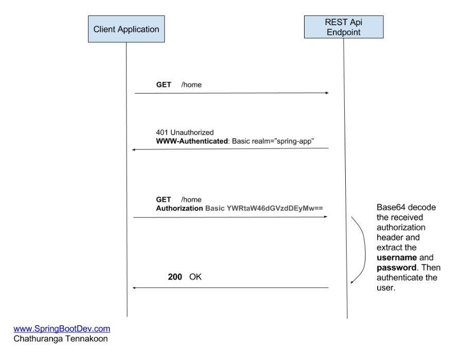 Basic authentication 은 base64를 사용하여 인코딩된 사용자 ID/암호 쌍으로 자격 증명을 전송합니다. 클라이언트는 Basic 단어 뒤에 공백과 base64로 인코딩된 문자열 username:password가 포함된 Authorization 헤더와 함께 HTTP 요청을 보냅니다.